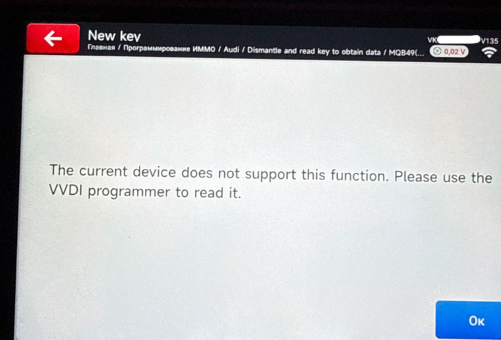 Ich habe versucht, den originalen VAG MQB49 5C-Schlüssel zu zerlegen und die Schlüsseldaten auszulesen, um mit dem Xhorse Key Tool MIDI einen Ersatzschlüssel hinzuzufügen. Das MIDI-Tool bietet diese Option zwar, meldet aber, dass die Funktion nicht unterstützt wird und der WDI Programmer zum Auslesen benötigt wird. Hat jemand eine Idee?