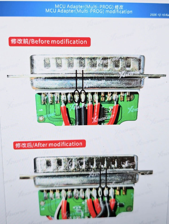 Zum Auslesen von MQB49 5C 5D-Schlüsseldaten ist außerdem eine Modifizierung des MCU-Adapters wie folgt erforderlich: Modifizieren Sie diese beiden schwarzen Drähte (GND kurz und GND lang).